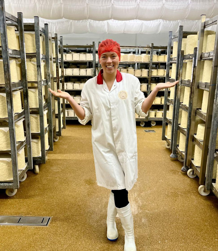 On my way from Norfolk to Lancashire for the event on Friday night I called into Cropwell Bishop Creamery and was thrilled to tour the dairy and join in the grading (that’s looking and tasting cheeses along their maturing journey) with their Cheese Specialist, India Bosden. Although the dairy is a large concern it still does almost every part of the cheese making process by hand.